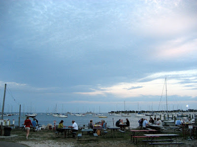 own drinks so, in accompaniment to our dinner, we shared a mini bottle of white wine. Our dinner arrived just as the sun slipped into the ocean. Ashley finished off the trip with the last, and one of the most delicious, lobster rolls, while I opted for a crab roll and Stuffies (a regional specialty of quahog clam, breadcrumbs, and veggies cooked together in the shell). Everything we ate was wonderful, enhanced I am sure, by the sauce of the fresh air, a beautiful view, and excellent company.