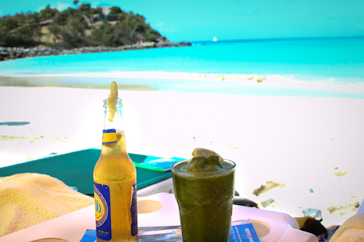 Ashley had to stop herself from having a third mint cooler (like a virgin mojito but with extra mint and lime); they were so, so good. I sampled some of the housemade, infused rum from the bar. And for lunch, we walked a few steps from our chairs to one of the restaurant’s colorful picnic tables: Ashley had a fish sandwich and I tried the ribs. Both seems to be fairly standard options around the island. I liked that my ribs came drizzled with honey.